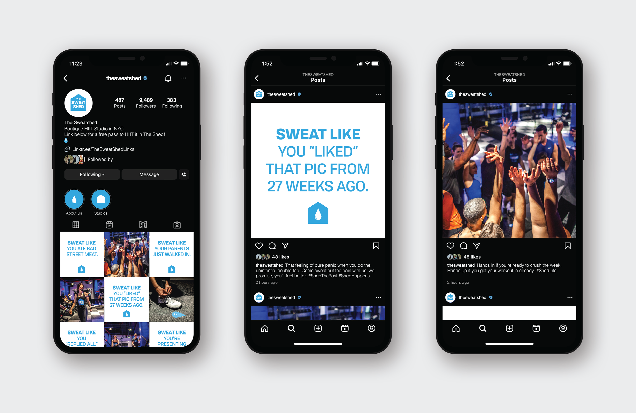 For the SweatShed identity, I transformed elements of the Crunch brand into something with a little more…well, intensity. The colors a little darker, the lighting a little moodier, the puns even punnier. As an extension of the Crunch brand, The SweatShed had an equally bold and clean logo, use of witty banter to promote the studio, and relatable content to create an inviting atmosphere.